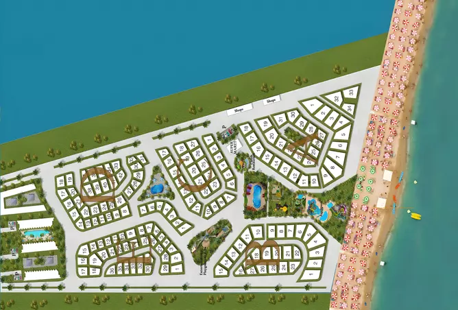 The project includes a distinguished range of recreational facilities, including a beach club, artificial lakes, and swimming pools strategically located to serve all areas of the compound.
